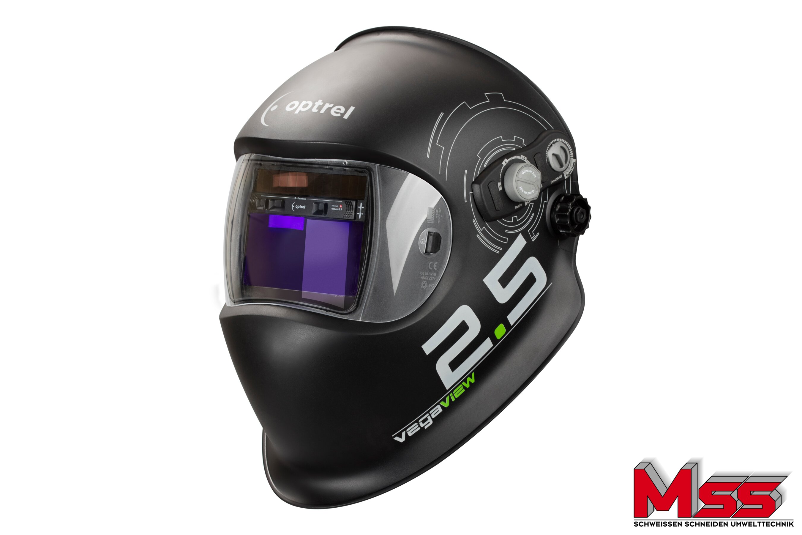 Weltrekord-Blendschutz mit Schutzstufe 2.5 / 8–12: Der optrel vegaview2.5 erfüllt endlich den wohl meistgeäusserten Wunsch der Schweisser nach heller Sicht. Mit seiner konkurrenzlos hellen Blendschutzkassette, die im Hellzustand bei Schutz-Stufe 2.5 eine gegenüber herkömmlichen Automatik-Schweisshelmen um etwa 400% verbesserte Durchsicht bietet, liegt der vegaview2.5 weltweit vorne.