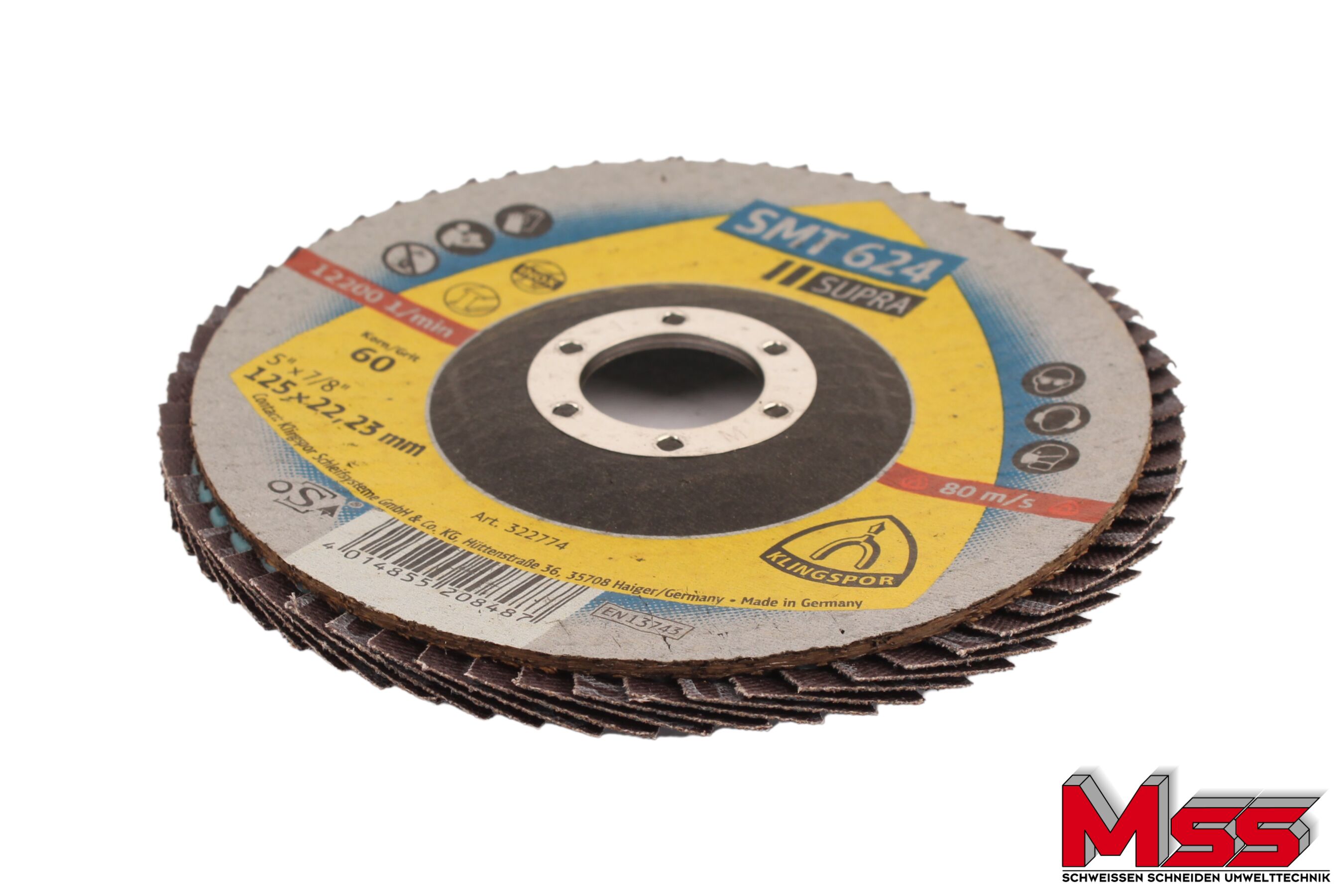 Schleifmopteller der Produktlinie „Supra“ zeichnen sich neben der Abtragsleistung durch eine hohe Standzeit aus. Sie sind daher ideal für den professionellen Einsatz sowie für hohe Ansprüche im Hobby- und Heimwerkerbereich. Gewährleistet werden die Leistungen der Fächerschleifscheibe SMT 624 Supra durch ein Korn aus robustem und leistungsfähigem Zirkonkorund. Das Material ist selbst nachschärfend, da sich die scharfen Kanten während des Schleifprozesses immer wieder neu bilden. Ein Teller aus robustem Glasgewebe erfüllt mit seiner extremen Festigkeit einen hohen Sicherheitsstandard. Abhängig vom Durchmesser der Scheibe beträgt die zulässige Drehzahl bis zu 15.300 pro Minute. Je größer der Schleifmopteller ist, umso geringer sind die zulässigen Drehzahlen. Eine Aufschrift auf der Scheibe gibt den jeweils zulässigen Drehbereich an.