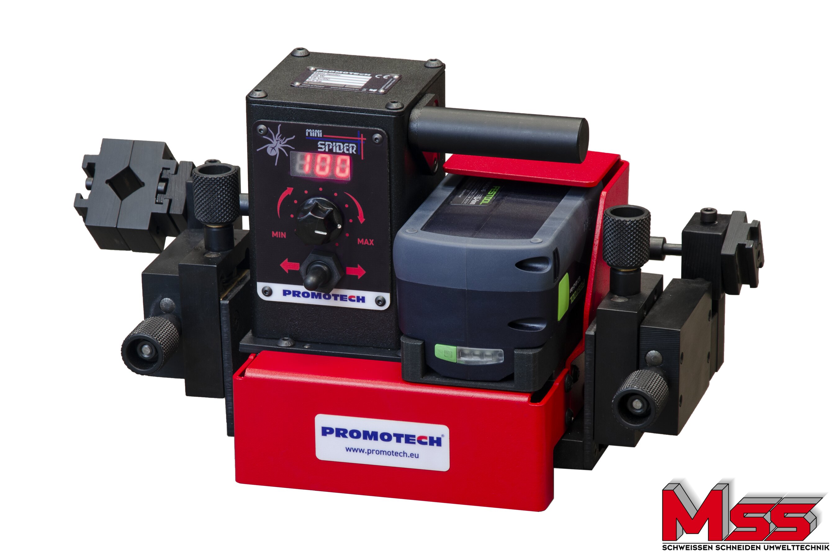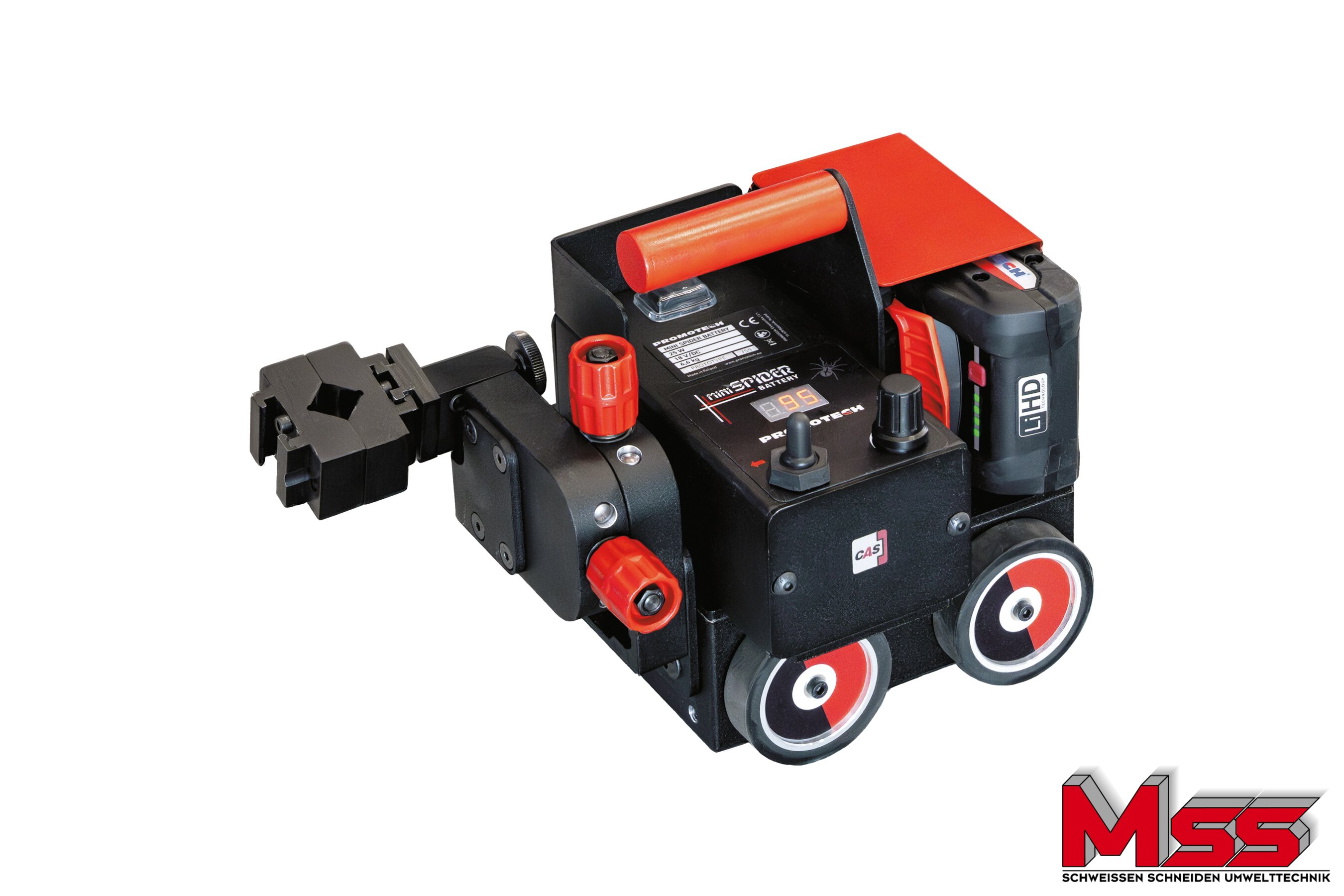 MINI SPIDER BATTERY ist ein batteriebetriebener Schweißtraktor für das kontinuierliche Schweißen mit MIG / MAG-Brennern. Der CAS-LiHD-Akku (High Density Lithium Ion) bietet ausreichend Leistung, um auch härteste Anwendungen ohne Kabel zu bewältigen.